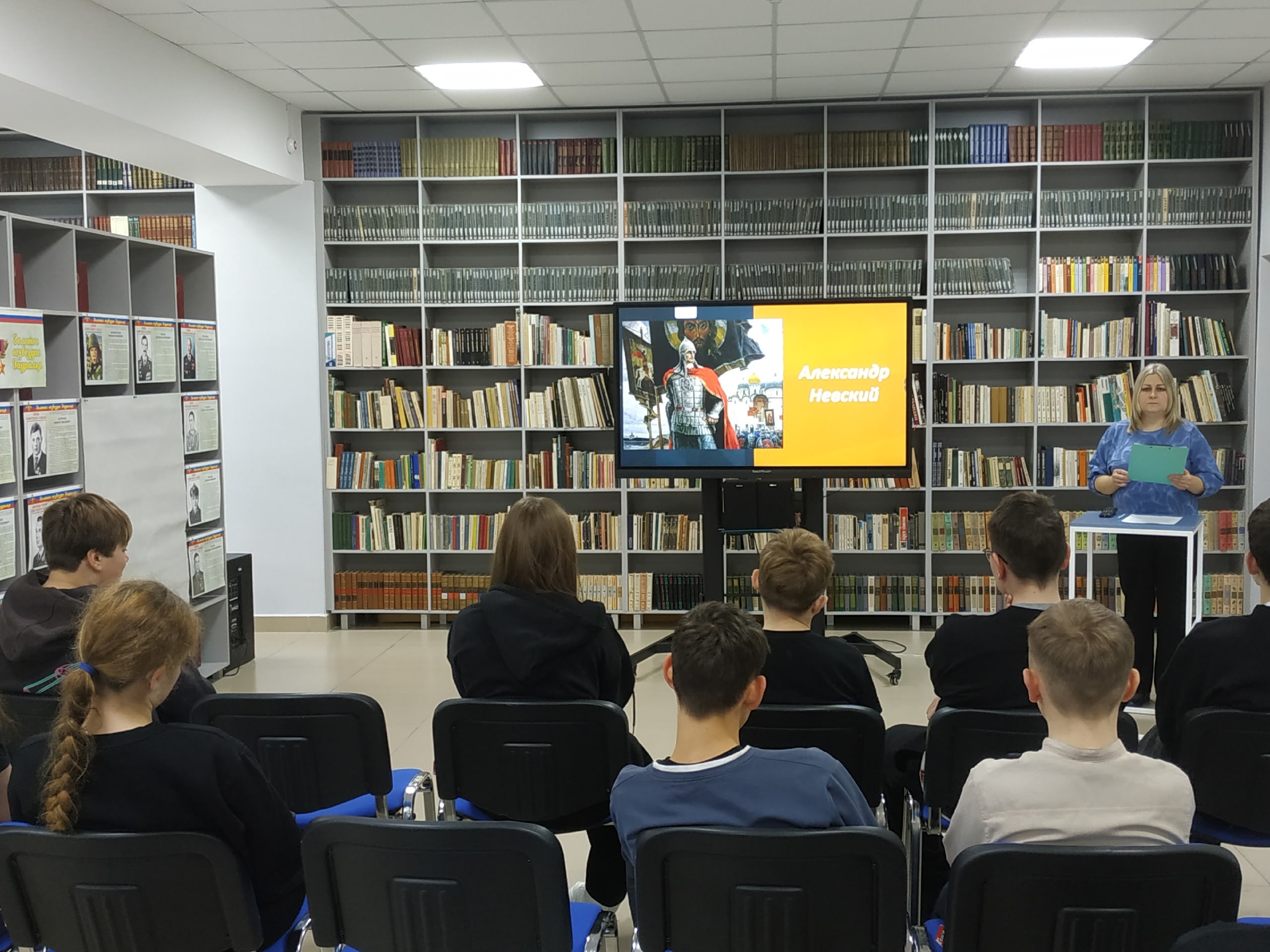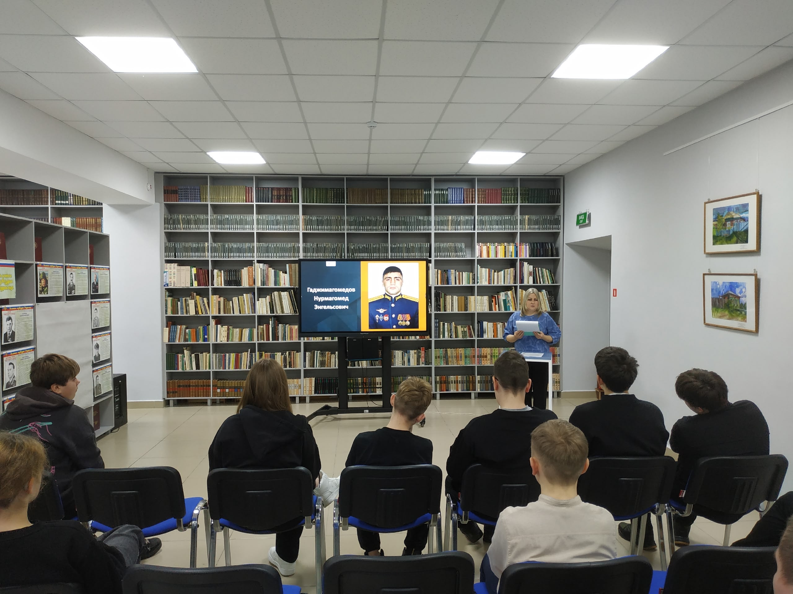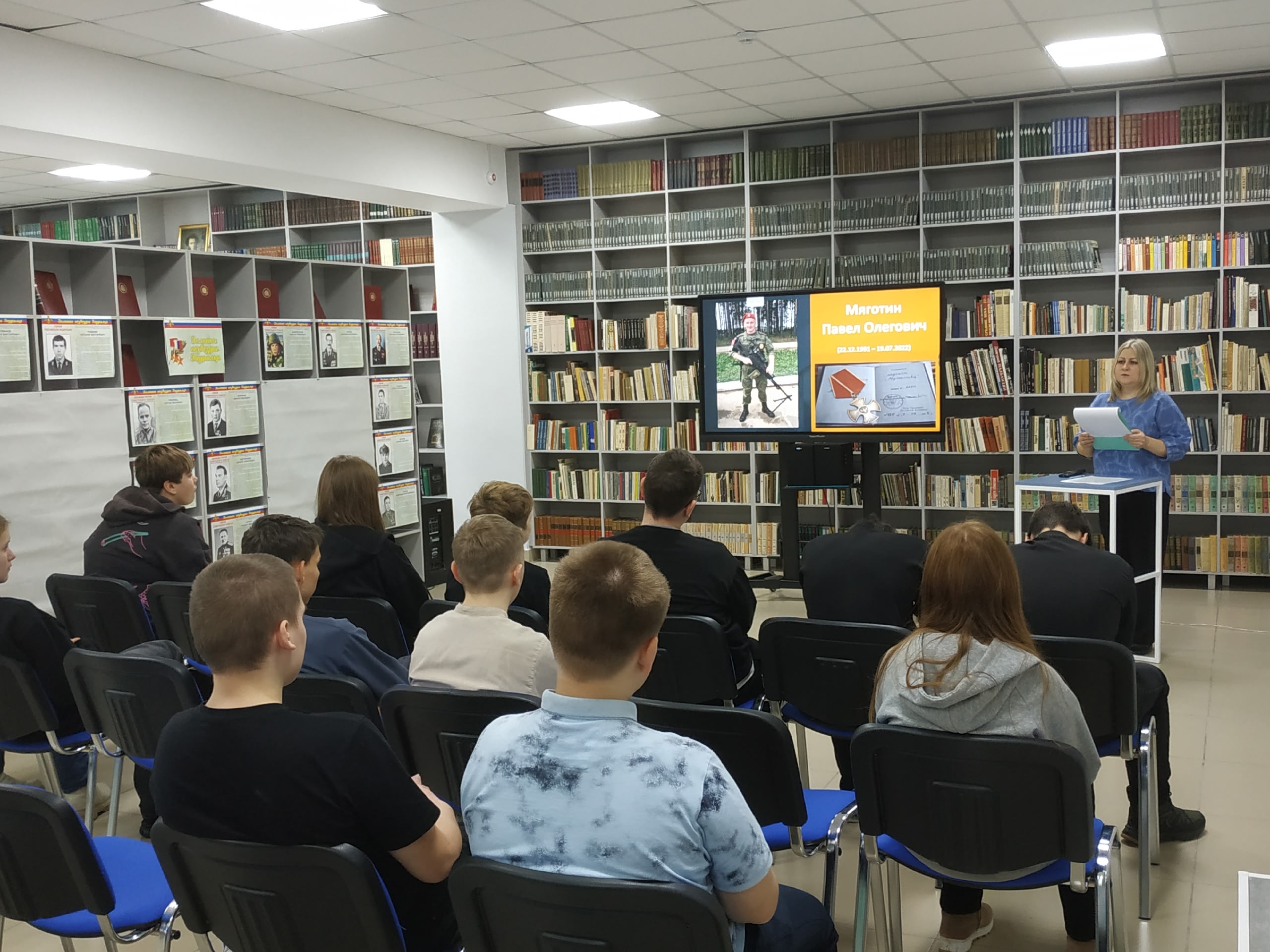 Библиотекарь также напомнила о современных вызовах, с которыми сталкивается Россия, и рассказала о специальной военной операции России на Украине. Особое внимание было уделено военнослужащим, которые исполнили свой долг в этой сложной обстановке. Среди первых, удостоенных звания Героя России, были названы Нурмагомед Энгельсович Гаджимагомедов и Максим Владимирович Песковой.